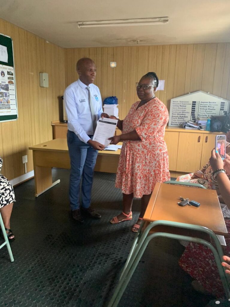 Newly appointed DH Mrs PN Msomi receives appointment letter from Principal to join School Management.